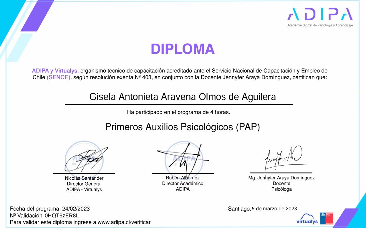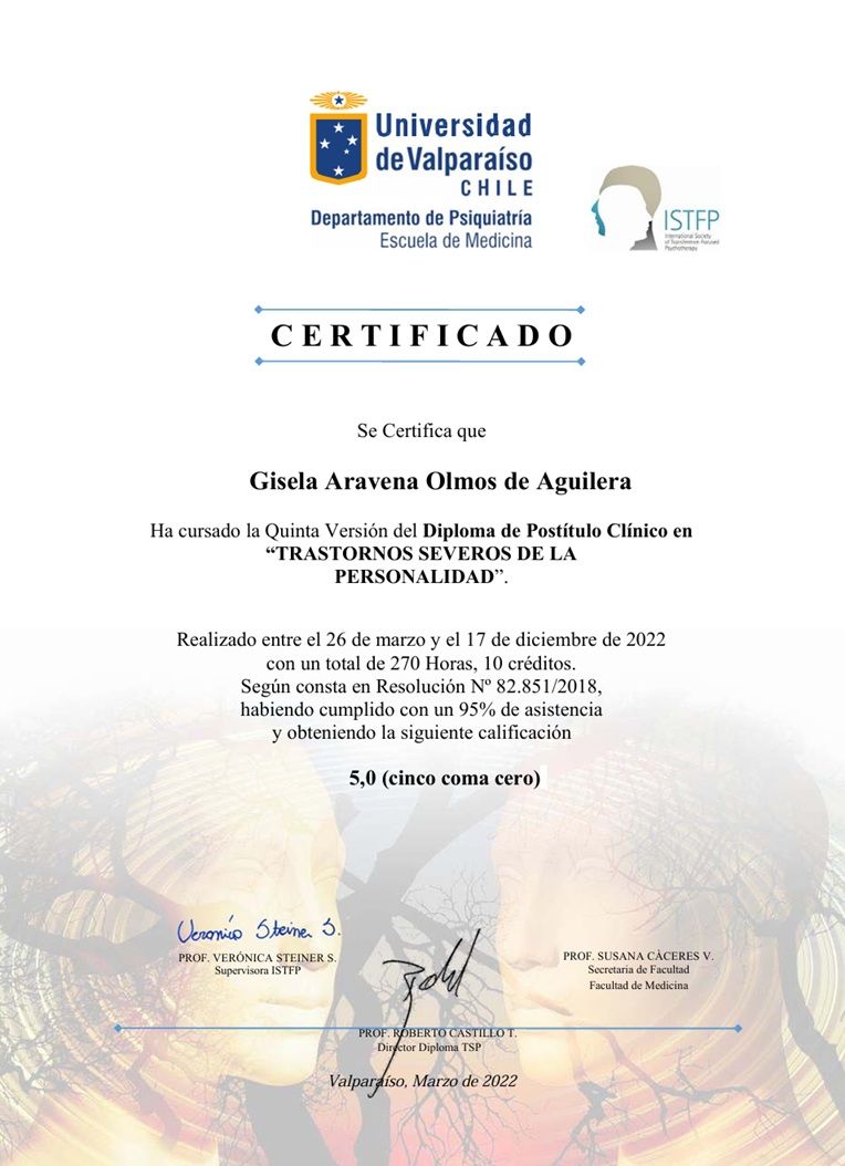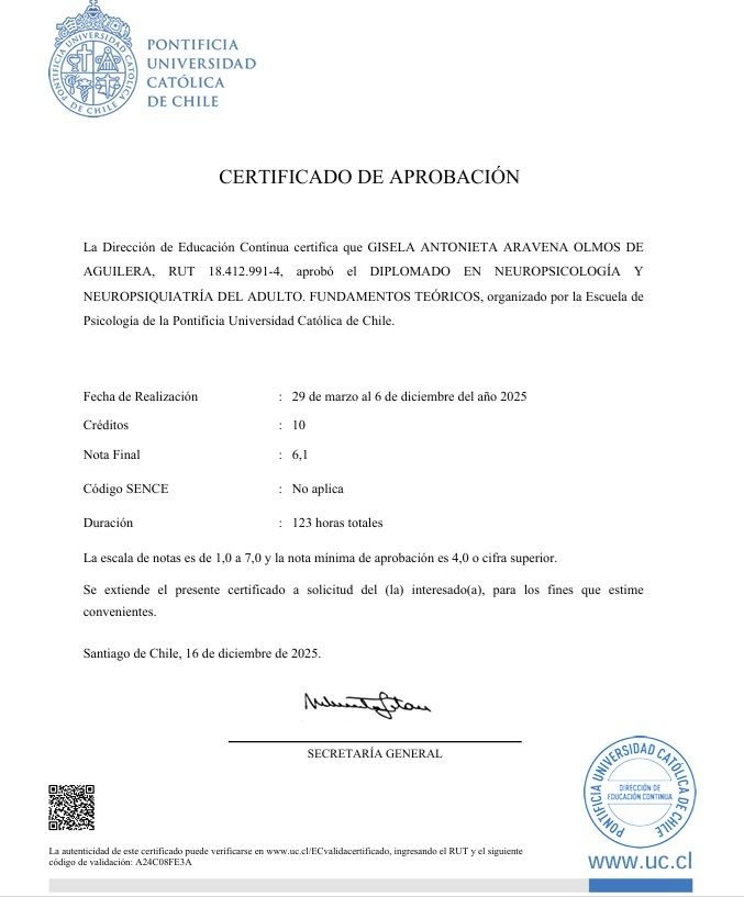 Cuento con formación especializada en áreas como psicoanálisis y salud mental, trastornos de la personalidad, neuropsicología del adulto y psicofarmacología para psicólogos, lo que fortalece mi abordaje clínico desde una perspectiva actualizada e integral. Además, he complementado mi formación en temáticas como psicooncología, primeros auxilios psicológicos, trastornos del espectro autista y técnicas proyectivas.